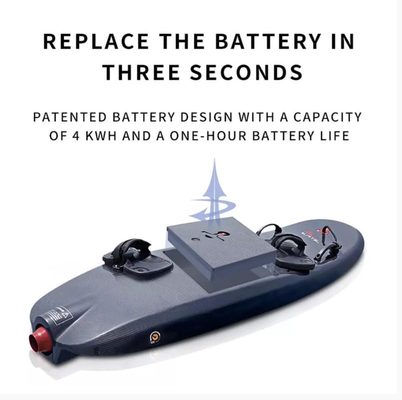 Battery life and charging are crucial features of the Jetfly. Included in the board package is a swappable rechargeable battery that offers an impressive amount of ride time per charge, depending on usage and weather conditions.  The convenience of switching to a spare battery or recharging the existing one allows you to quickly get back on the water, maximising your ride time.